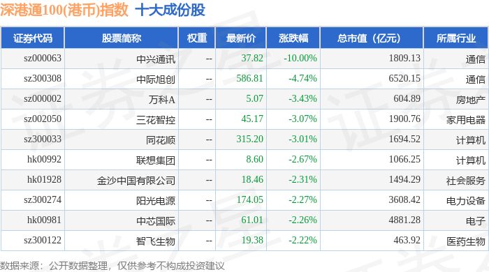 深港通100(港币)(983008)指数十大成份股详情如下: