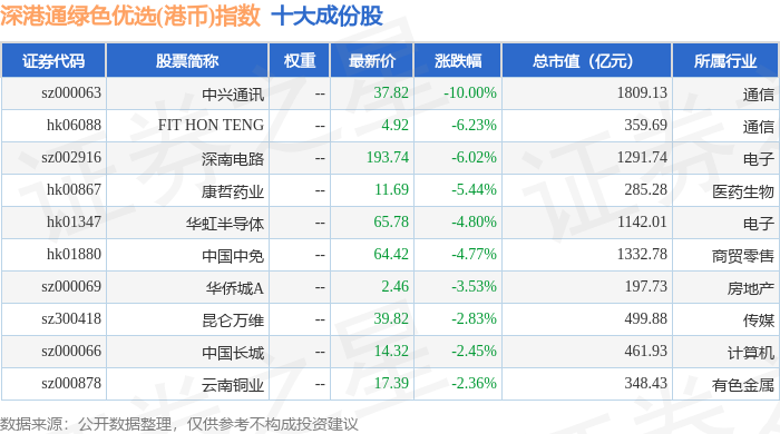 深港通绿色优选(港币)(983012)指数十大成份股详情如下: