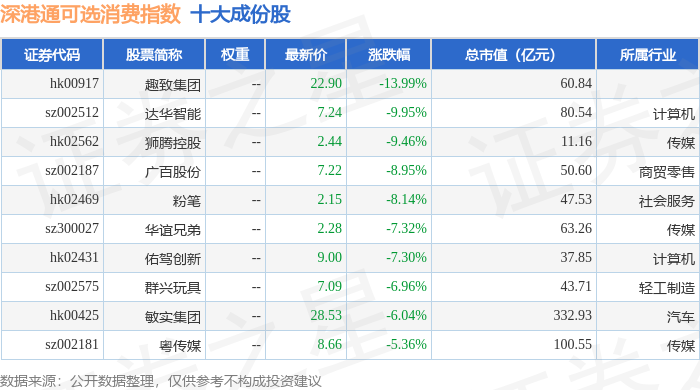 证券之星消息,12月11日,深港通可选消费(983019)指数报收于5596.84点,跌1.01%,成交1122.84亿元,换手率1.72%。当日该指数成份股中,上涨的有39家,汇量科技以14.76%的涨幅领涨,下跌的有266家,趣致集团以13.99%的跌幅领跌。