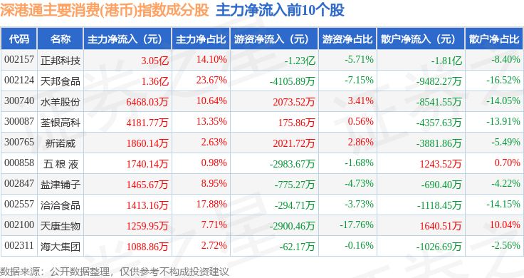 资金流向方面,深港通主要消费(港币)(983022)指数成份股当日主力资金净流出合计11.25亿元,游资资金净流入合计1.41亿元,散户资金净流入合计9.83亿元。成份股资金流向详情见下表: