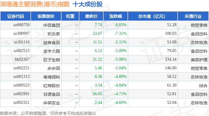 深港通主要消费(港币)(983022)指数十大成份股详情如下: