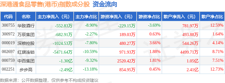 资金流向方面,深港通食品零售(港币)(983038)指数成份股当日主力资金净流出合计4.56亿元,游资资金净流入合计4787.44万元,散户资金净流入合计4.08亿元。成份股资金流向详情见下表: