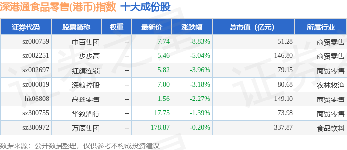 深港通食品零售(港币)(983038)指数十大成份股详情如下: