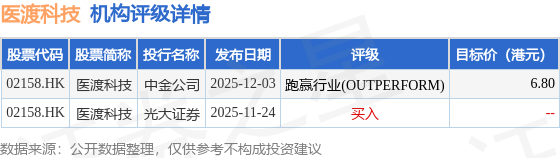 截至2025年12月11日收盘,医渡科技(02158.HK)报收于4.96港元,下跌2.94%,成交量557.02万股,成交额2797.61万港元。投行对该股的评级以跑赢行业(OUTPERFORM)为主,近90天内共有1家投行给出跑赢行业(OUTPERFORM)评级,近90天的目标均价为6.8港元。中金公司最新一份研报给予医渡科技跑赢行业(OUTPERFORM)评级,目标价6.8港元。