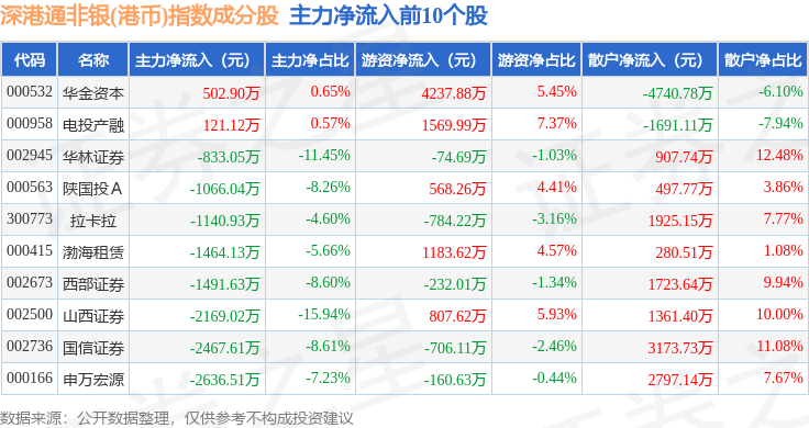 资金流向方面,深港通非银(港币)(983054)指数成份股当日主力资金净流出合计14.22亿元,游资资金净流入合计4.24亿元,散户资金净流入合计9.98亿元。成份股资金流向详情见下表: