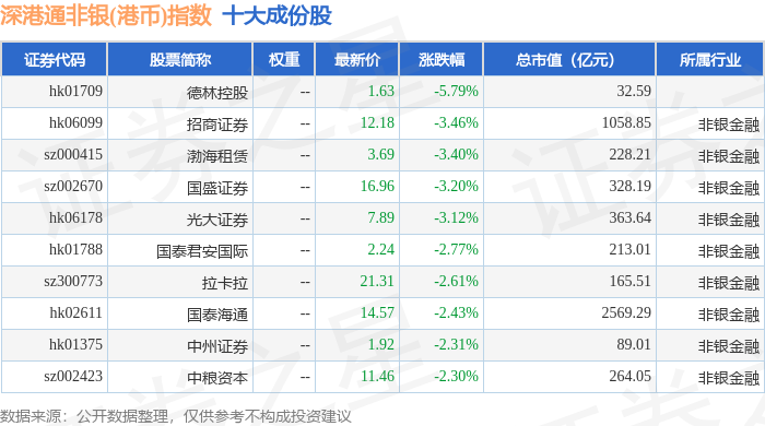 深港通非银(港币)(983054)指数十大成份股详情如下: