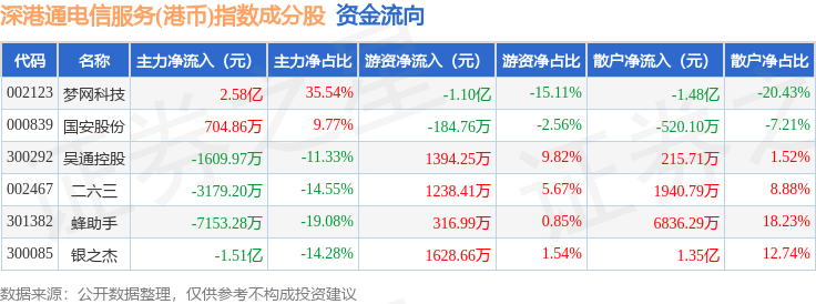 资金流向方面,深港通电信服务(港币)(983058)指数成份股当日主力资金净流出合计486.65万元,游资资金净流出合计6592.02万元,散户资金净流入合计7078.68万元。成份股资金流向详情见下表: