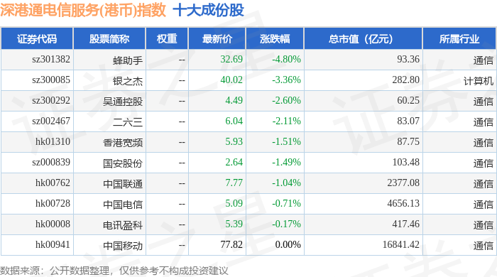 深港通电信服务(港币)(983058)指数十大成份股详情如下: