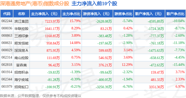 资金流向方面,深港通房地产(港币)(983072)指数成份股当日主力资金净流出合计8.11亿元,游资资金净流入合计1.55亿元,散户资金净流入合计6.56亿元。成份股资金流向详情见下表: