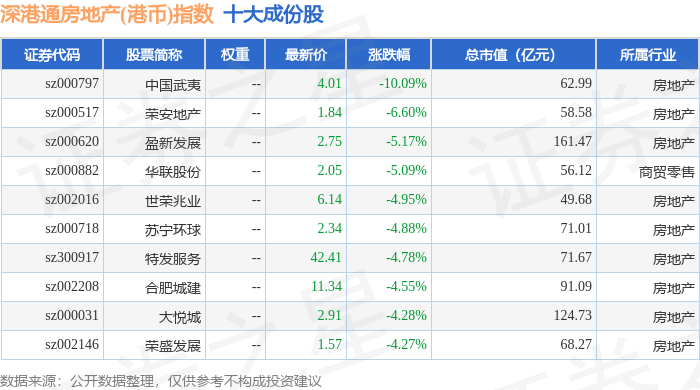 深港通房地产(港币)(983072)指数十大成份股详情如下: