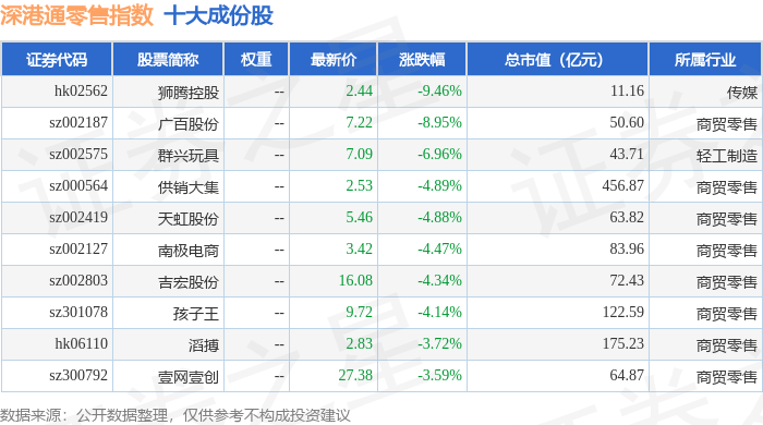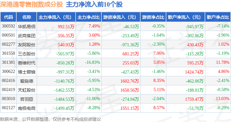 资金流向方面,深港通零售(983073)指数成份股当日主力资金净流出合计5.05亿元,游资资金净流入合计150.19万元,散户资金净流入合计5.04亿元。成份股资金流向详情见下表: