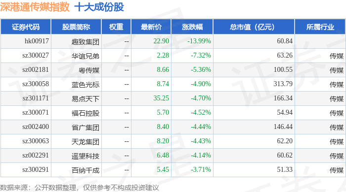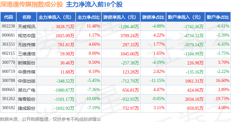 资金流向方面,深港通传媒(983075)指数成份股当日主力资金净流出合计26.19亿元,游资资金净流入合计1.69亿元,散户资金净流入合计24.5亿元。成份股资金流向详情见下表: