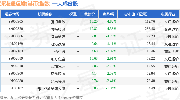 深港通运输(港币)(983078)指数十大成份股详情如下: