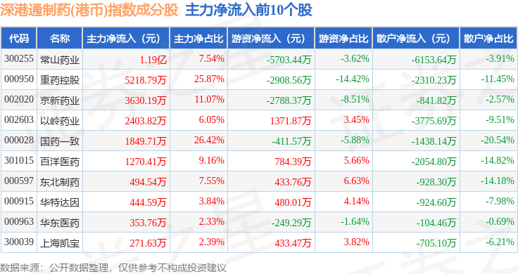 资金流向方面,深港通制药(港币)(983080)指数成份股当日主力资金净流出合计8.95亿元,游资资金净流出合计5199.38万元,散户资金净流入合计9.47亿元。成份股资金流向详情见下表: