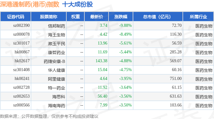 深港通制药(港币)(983080)指数十大成份股详情如下: