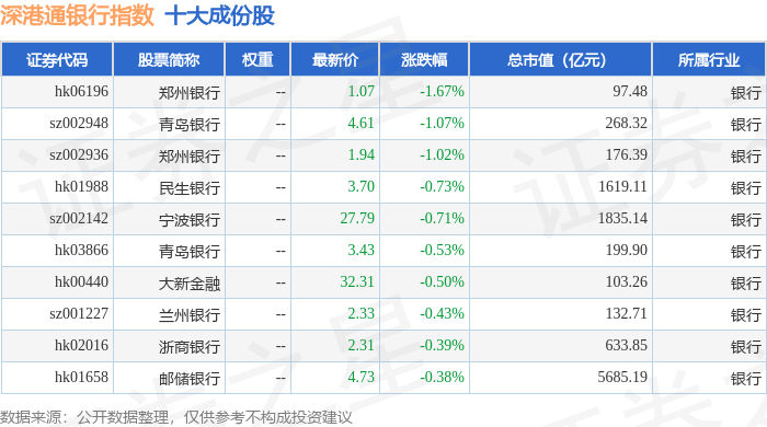 证券之星消息,12月11日,深港通银行(983081)指数报收于7485.79点,涨0.39%,成交93.37亿元,换手率0.18%。当日该指数成份股中,上涨的有15家,汇丰控股以2.06%的涨幅领涨,下跌的有14家,郑州银行以1.67%的跌幅领跌。