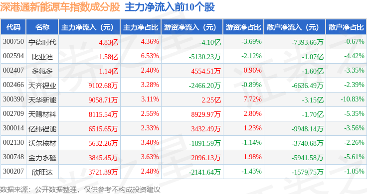 资金流向方面,深港通新能源车(983087)指数成份股当日主力资金净流出合计13.26亿元,游资资金净流入合计6.83亿元,散户资金净流入合计6.43亿元。成份股资金流向详情见下表: