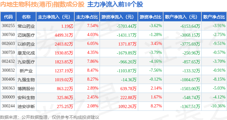 资金流向方面,内地生物科技(港币)(983102)指数成份股当日主力资金净流出合计1.56亿元,游资资金净流出合计3783.97万元,散户资金净流入合计1.94亿元。成份股资金流向详情见下表: