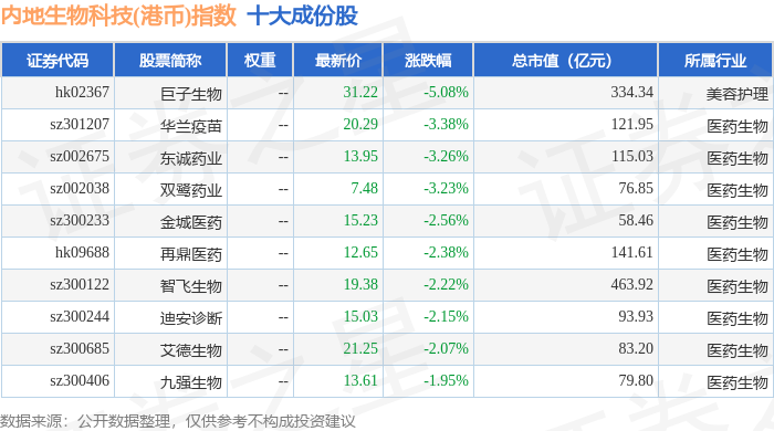 内地生物科技(港币)(983102)指数十大成份股详情如下:
