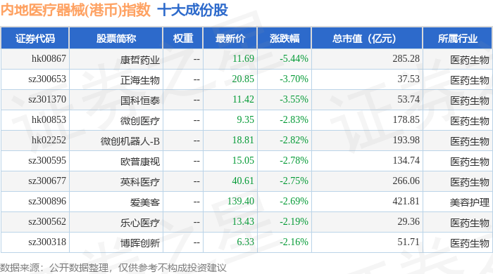 内地医疗器械(港币)(983104)指数十大成份股详情如下: