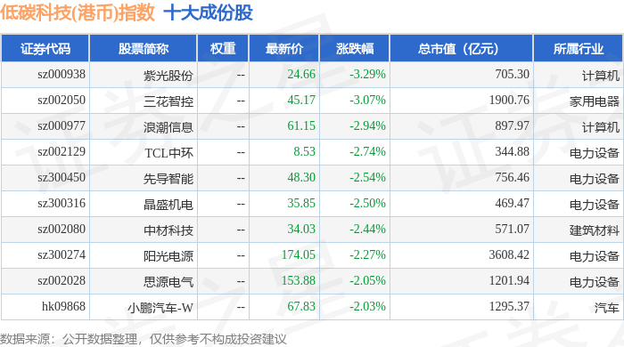 低碳科技(港币)(983161)指数十大成份股详情如下: