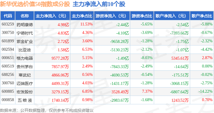 资金流向方面,新华优选价值50(989004)指数成份股当日主力资金净流出合计103.29亿元,游资资金净流入合计40.55亿元,散户资金净流入合计62.74亿元。成份股资金流向详情见下表: