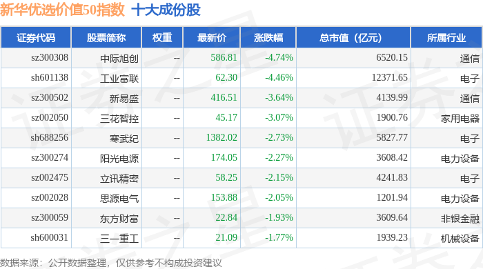 新华优选价值50(989004)指数十大成份股详情如下: