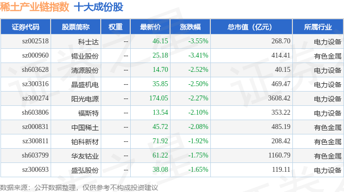 稀土产业链(989013)指数十大成份股详情如下: