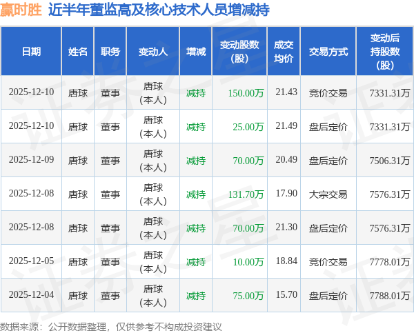 证券之星消息,根据12月11日市场公开信息、上市公司公告及交易所披露数据整理,赢时胜(300377)最新董监高及相关人员股份变动情况:2025年12月9日至2025年12月10日公司董事唐球共减持公司股份245.0万股,占公司总股本为0.3262%。变动期间公司股价上涨0.89%,12月10日当日收盘报21.49元。