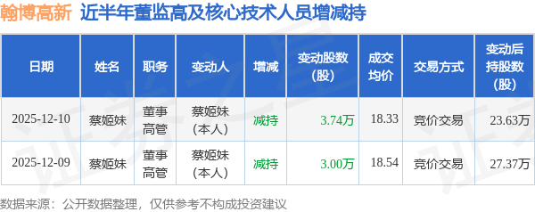 证券之星消息,根据12月11日市场公开信息、上市公司公告及交易所披露数据整理,翰博高新(301321)最新董监高及相关人员股份变动情况:2025年12月10日公司董事,高管蔡姬妹共减持公司股份3.74万股,占公司总股本为0.0201%。变动期间公司股价上涨0.33%,12月10日当日收盘报18.21元。