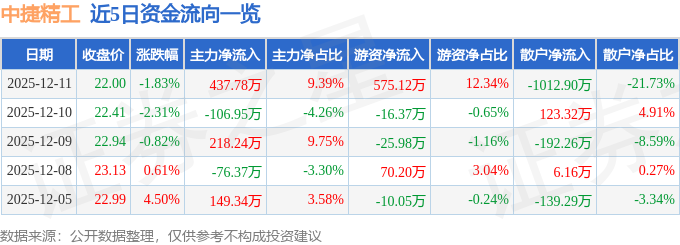 证券之星消息,截至2025年12月11日收盘,中捷精工(301072)报收于22.0元,下跌1.83%,换手率3.09%,成交量2.08万手,成交额4662.17万元。