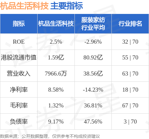 杭品生活科技港股市值1.59亿港元,在服装家纺行业中排名第55。主要指标见下表: