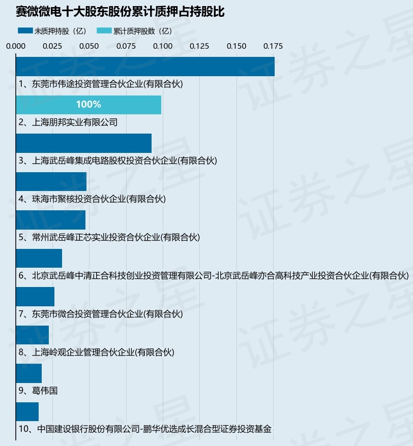 截止本公告日,股东上海朋邦实业有限公司已累计质押股份990.63万股,占其持股总数的100.0%。本次质押后赛微微电十大股东的累计质押股份占持股比例(占持股比例的计算以公司最新一期财务报表公布的十大股东的持股总数为基准)见下图: