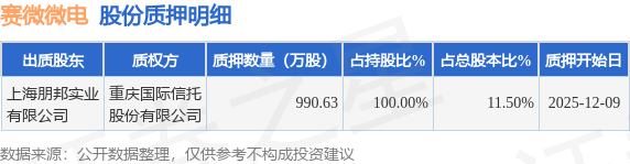 证券之星消息,赛微微电(688325)12月12日公开信息显示,股东上海朋邦实业有限公司向重庆国际信托股份有限公司合计质押990.63万股,占总股本11.5%。质押详情见下表:
