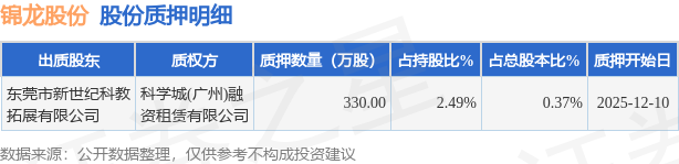 证券之星消息,锦龙股份(000712)12月12日公开信息显示,股东东莞市新世纪科教拓展有限公司向科学城(广州)融资租赁有限公司合计质押330.0万股,占总股本0.37%。质押详情见下表:
