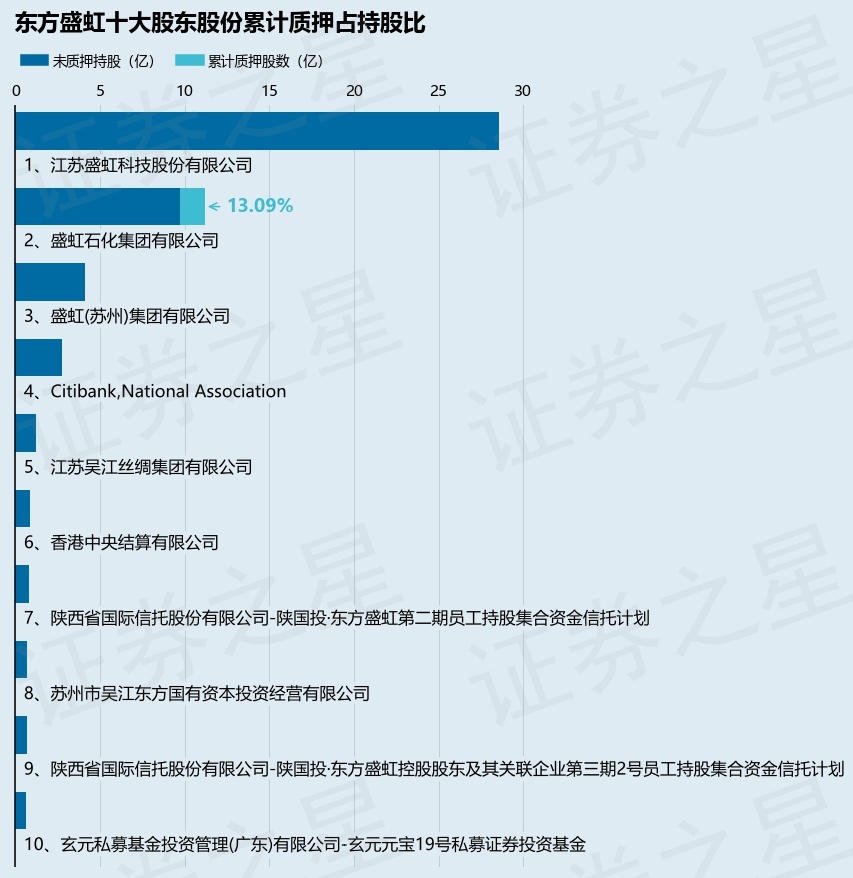 截止本公告日,股东盛虹石化集团有限公司已累计质押股份1.46亿股,占其持股总数的13.09%。本次质押后东方盛虹十大股东的累计质押股份占持股比例(占持股比例的计算以公司最新一期财务报表公布的十大股东的持股总数为基准)见下图: