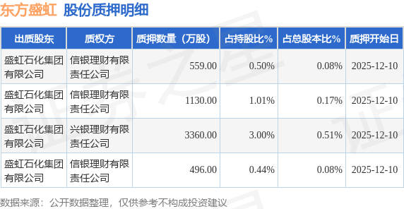 证券之星消息,东方盛虹(000301)12月12日公开信息显示,股东盛虹石化集团有限公司向信银理财有限责任公司、兴银理财有限责任公司合计质押5545.0万股,占总股本0.84%。质押详情见下表: