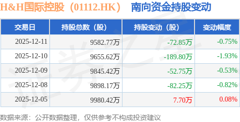 证券之星消息,12月11日南向资金减持72.85万股H&H国际控股(01112.HK)。近5个交易日中,获南向资金减持的有4天,累计净减持389.95万股。近20个交易日中,获南向资金减持的有15天,累计净减持635.95万股。截至目前,南向资金持有H&H国际控股(01112.HK)9582.77万股,占公司已发行普通股的14.83%。