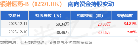 证券之星消息,12月11日南向资金增持28.88万股银诺医药-B(02591.HK)。截至目前,南向资金持有银诺医药-B(02591.HK)59.34万股,占公司已发行普通股的0.13%。