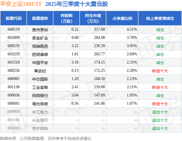 平安上证180ETF基金成立于2025年1月15日,基金经理为刘洁倩,基金跟踪标的为上证180指数,成立以来超额回报为2.05%,近一个月超额回报为0.03%。最新披露的基金持仓数据显示,截止2025年9月30日,该基金第一大重仓股为贵州茅台(600519),持股占比为4.21%。