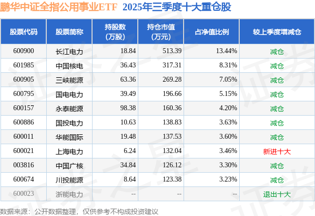 鹏华中证全指公用事业ETF基金成立于2024年12月25日,基金经理为闫冬,基金跟踪标的为中证全指公用事业指数,成立以来超额回报为3.51%,近一个月超额回报为0.14%。最新披露的基金持仓数据显示,截止2025年9月30日,该基金第一大重仓股为长江电力(600900),持股占比为13.44%。