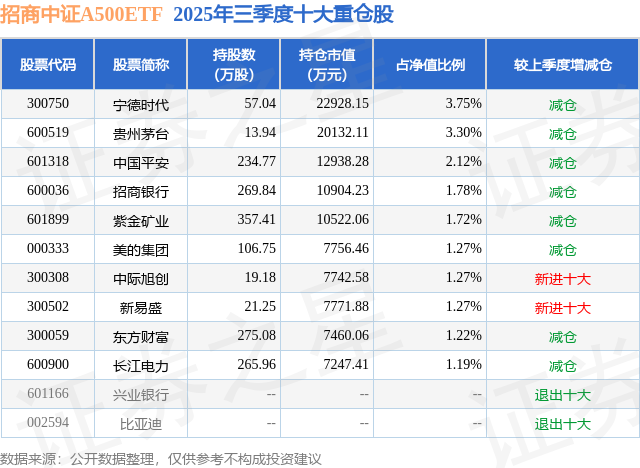 招商中证A500ETF基金成立于2024年9月26日,基金经理为刘重杰 许荣漫,基金跟踪标的为中证A500指数,成立以来超额回报为-23.7%,近一个月超额回报为0.07%。最新披露的基金持仓数据显示,截止2025年9月30日,该基金第一大重仓股为宁德时代(300750),持股占比为3.75%。
