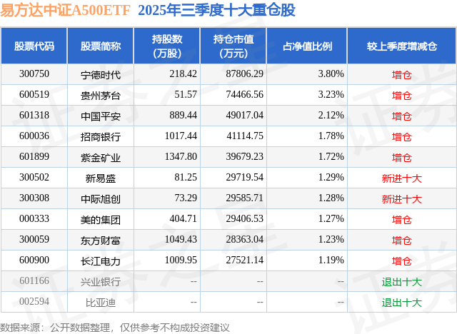 易方达中证A500ETF基金成立于2024年11月12日,基金经理为庞亚平,基金跟踪标的为中证A500指数,成立以来超额回报为6.29%,近一个月超额回报为0.03%。最新披露的基金持仓数据显示,截止2025年9月30日,该基金第一大重仓股为宁德时代(300750),持股占比为3.8%。
