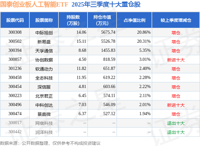 国泰创业板人工智能ETF基金成立于2025年3月26日,基金经理为麻绎文,基金跟踪标的为创业板人工智能指数,成立以来超额回报为2.2%,近一个月超额回报为-0.06%。最新披露的基金持仓数据显示,截止2025年9月30日,该基金第一大重仓股为中际旭创(300308),持股占比为20.86%。