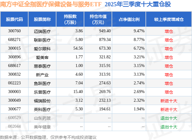 南方中证全指医疗保健设备与服务ETF基金成立于2021年10月22日,基金经理为朱恒红,基金跟踪标的为中证全指医疗保健设备与服务指数,成立以来超额回报为2.47%,近一个月超额回报为0.0%。最新披露的基金持仓数据显示,截止2025年9月30日,该基金第一大重仓股为迈瑞医疗(300760),持股占比为9.47%。