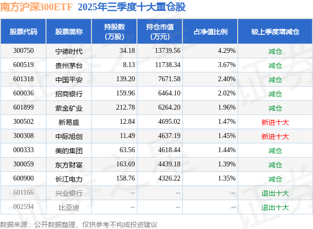 南方沪深300ETF基金成立于2013年2月18日,基金经理为罗文杰,基金跟踪标的为沪深300指数,成立以来超额回报为76.74%,近一个月超额回报为0.11%。最新披露的基金持仓数据显示,截止2025年9月30日,该基金第一大重仓股为宁德时代(300750),持股占比为4.29%。