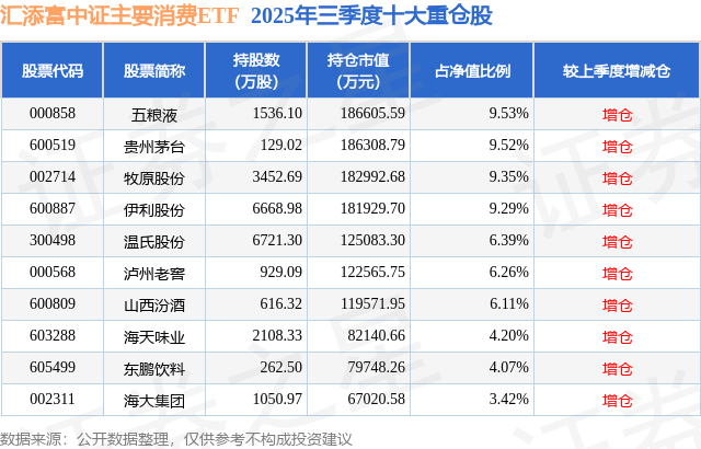 汇添富中证主要消费ETF基金成立于2013年8月23日,基金经理为过蓓蓓,基金跟踪标的为中证主要消费指数,成立以来超额回报为33.34%,近一个月超额回报为0.05%。最新披露的基金持仓数据显示,截止2025年9月30日,该基金第一大重仓股为五粮液(000858),持股占比为9.53%。