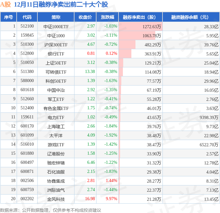 A股融券净卖出前三分别为:中证1000ETF(512100)融券净卖出1272.63万股、中证1000(159845)融券净卖出1063.78万股、沪深300ETF(510300)融券净卖出482.29万股,前20具体见下表: