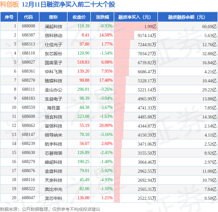 科创板融资净买入前三分别为:澜起科技(688008)融资净买入1.99亿元、信科移动(688387)融资净买入9174.14万元、仕佳光子(688313)融资净买入7244.91万元,前20具体见下表: