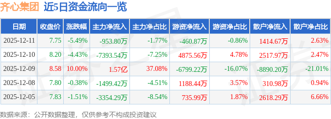 证券之星消息,截至2025年12月11日收盘,齐心集团(002301)报收于7.75元,下跌5.49%,换手率9.58%,成交量68.79万手,成交额5.37亿元。